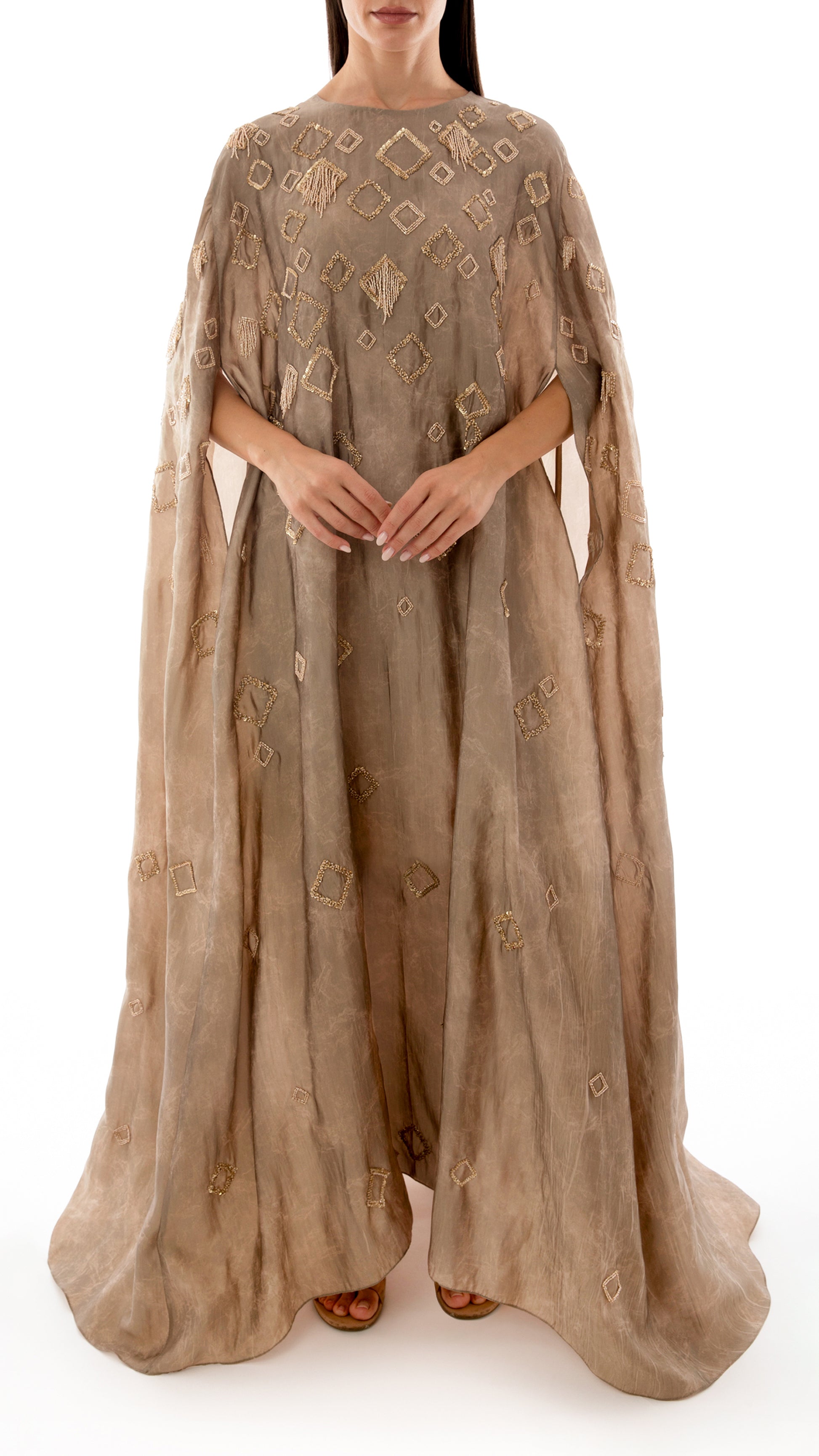 Embellished Tassel Detail Cape Dress in bronze-gold abstract textured satin viscose-nylon fabric, featuring all-over breeze block–inspired motifs embroidered with sequins and beads, finished with tassel accents. The flowy fabric enhances the grandeur, adding flare, volume, and an elegant cape silhouette.