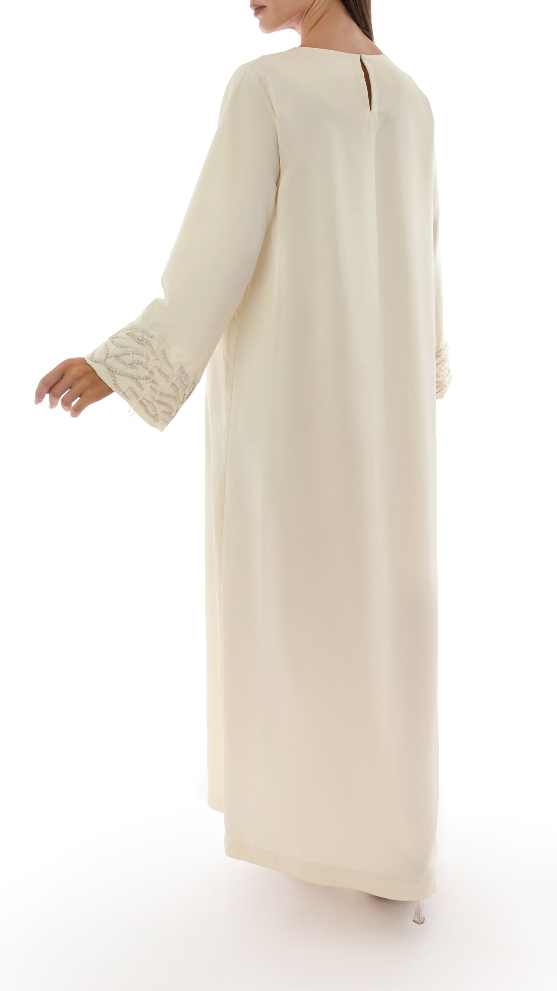Embroidered Bell Sleeve Dress crafted in off-white satin viscose linen with a subtle lustre. Featuring a bateau neckline and a regular-fit flared silhouette, the dress is elevated with unique abstract thread embroidery adorning the statement bell sleeves.