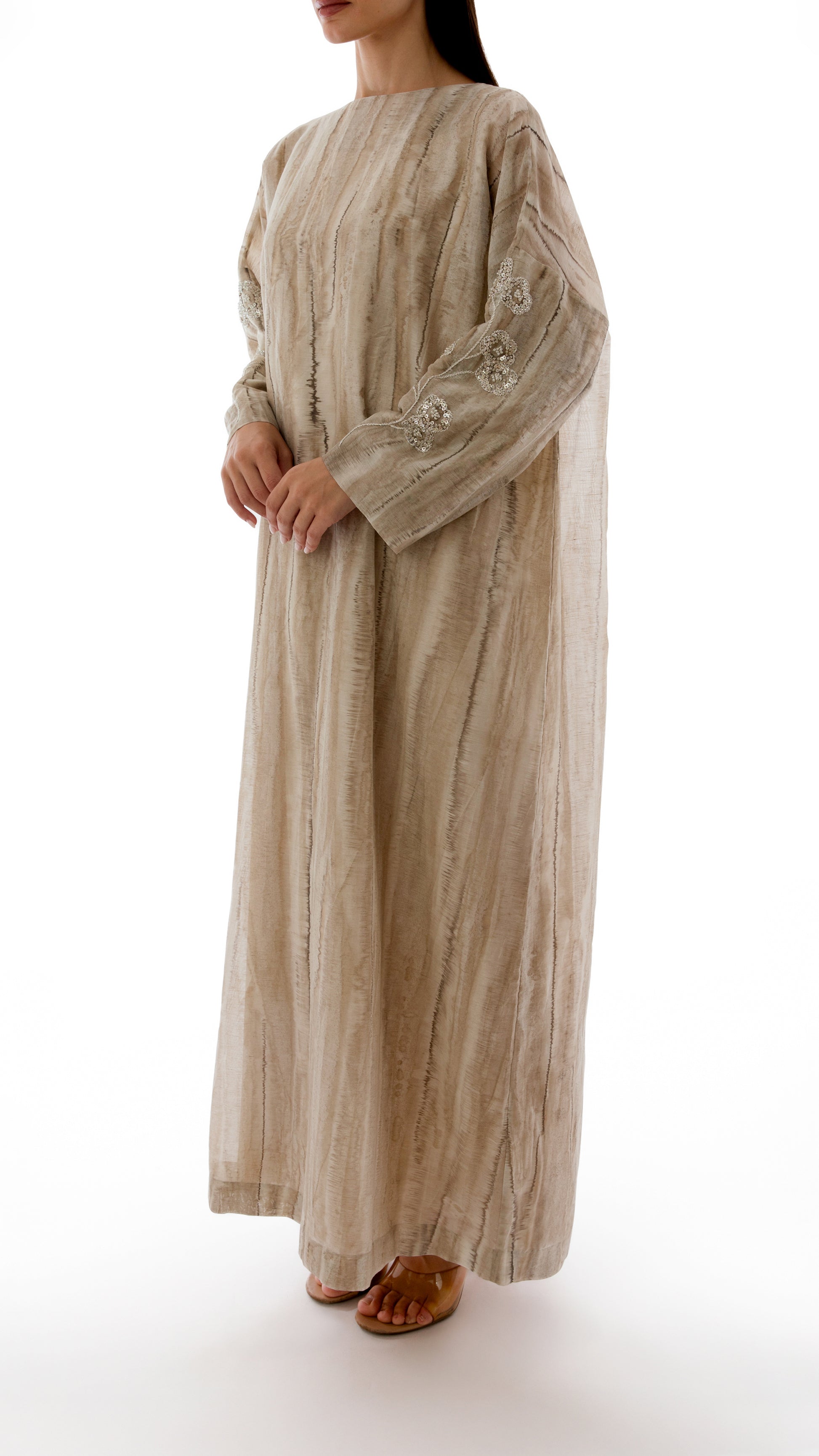 Floral Embroidered Oversized Dress in beige abstract shibori-printed tencel-linen, paired with a silk satin inner dress. Designed with drop-shoulder boxy sleeves, the statement panels are adorned with intricate floral embroidery in silver metallic thread, sequins, and beads, creating a striking embellishment against the oversized silhouette.