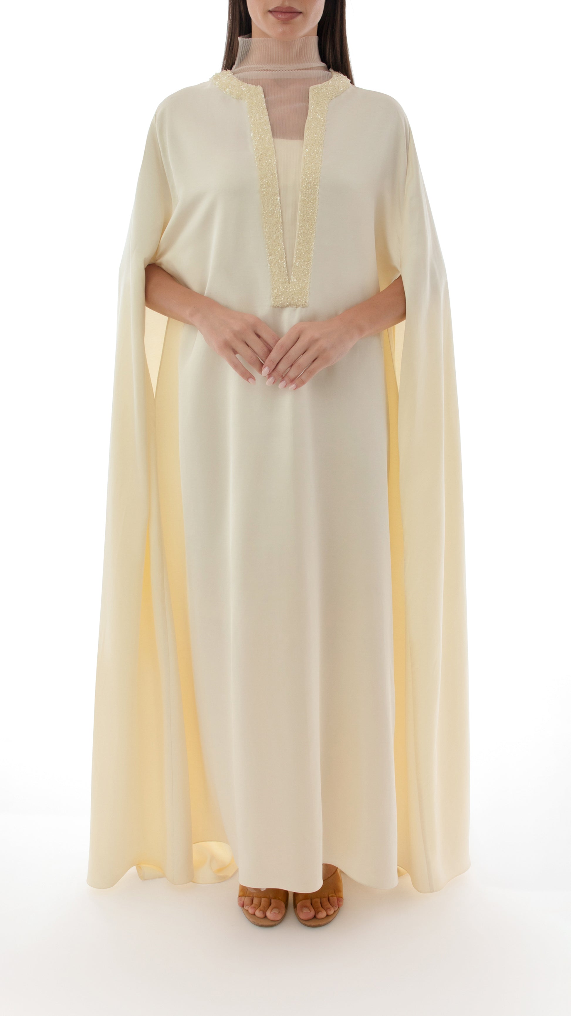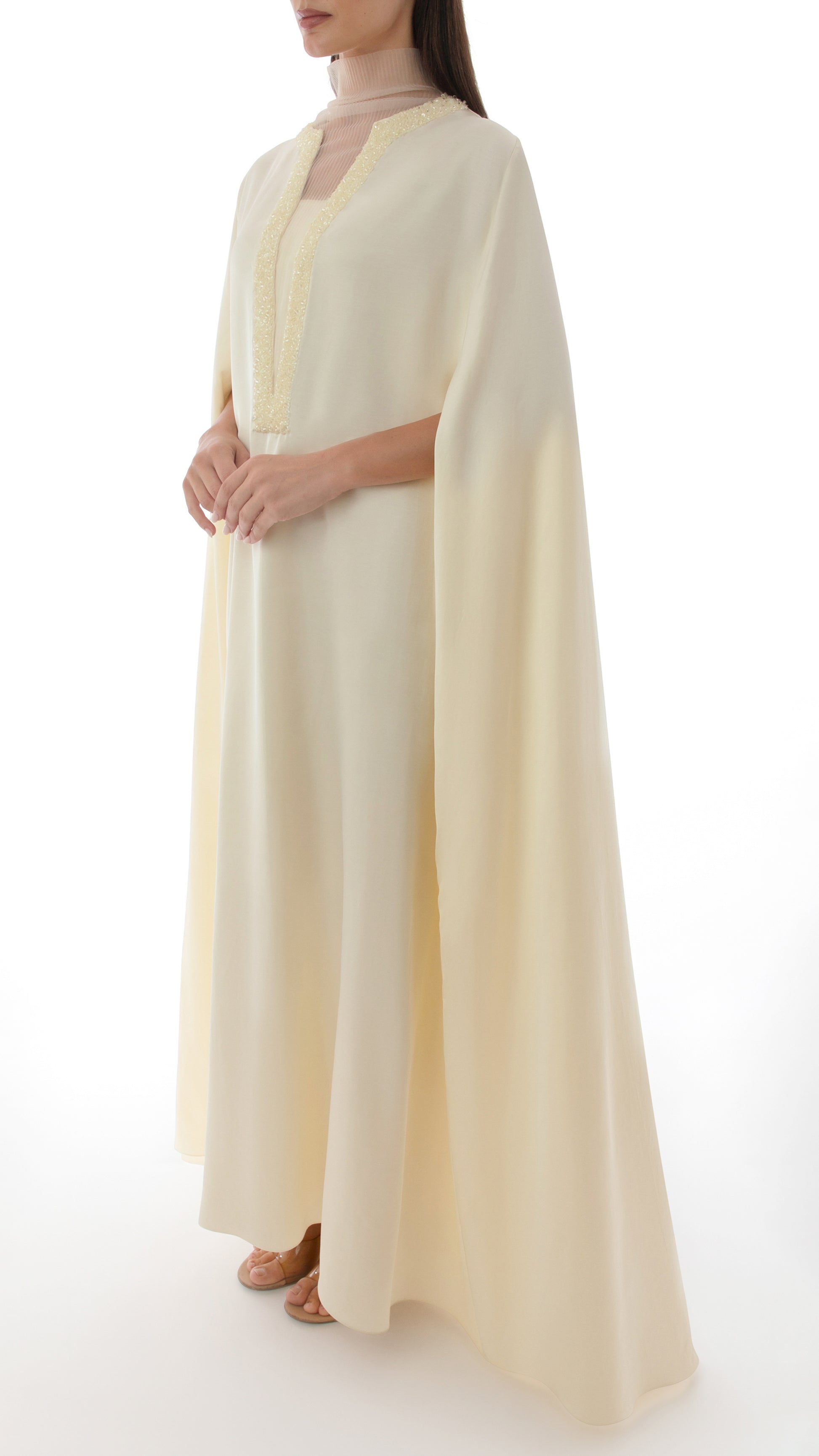Intricate Embellished Cape Dress crafted in off-white satin viscose-linen fabric. Featuring a deep V-neckline cut-out lined with pleated tulle that extends into a high-neck collar, creating the illusion of a see-through inner dress beneath the cape. The neckline is richly adorned with off-white cut beads, sequins, and crystal beads. Added flare and volume enhance the grandeur of the silhouette.